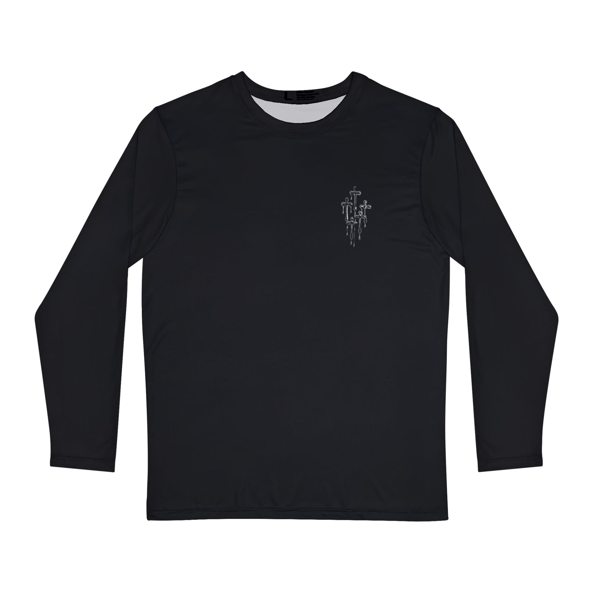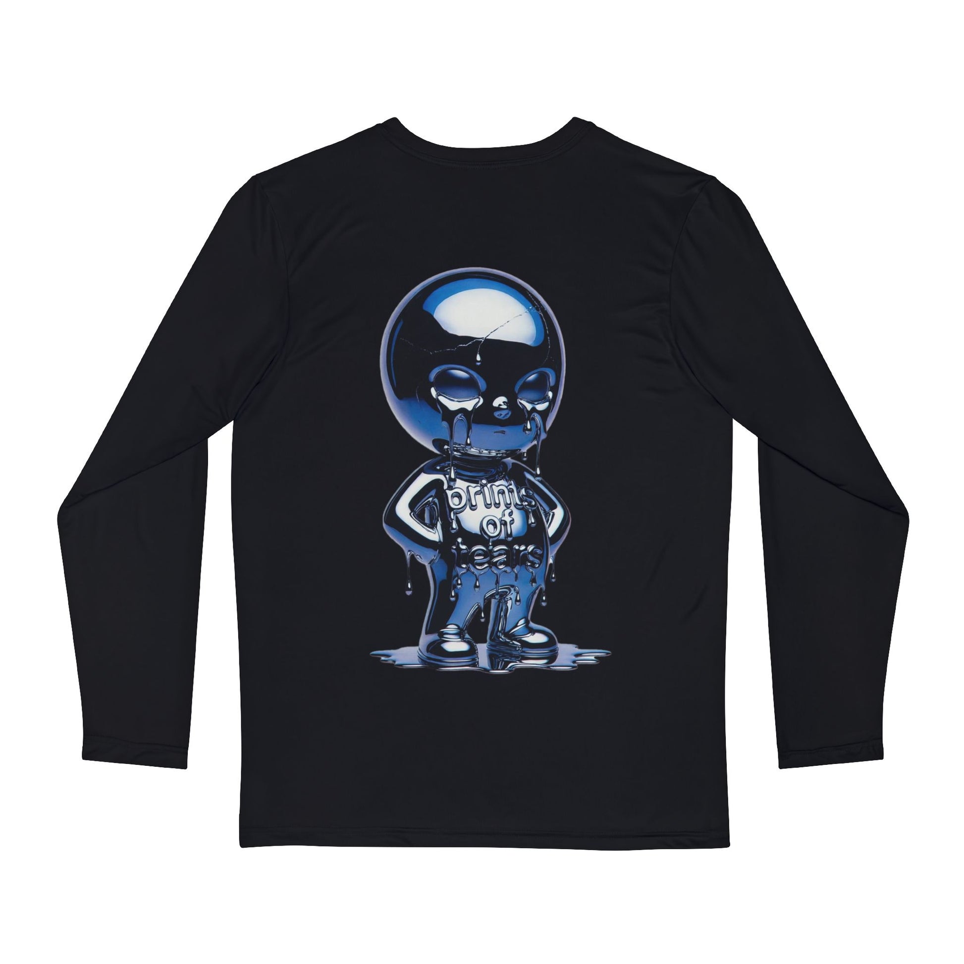 This long-sleeve shirt carries a quiet, streetwise energy — a slim, black silhouette with a small, distressed chest emblem and a bold, glossy character printed on the back. The design feels like a midnight alley scene: cool blues and reflective highlights make the character pop against deep black fabric, giving the shirt an urban, slightly rebellious mood. Lightweight and built to move, it layers easily under jackets or stands alone on cooler evenings. Wear it to skate spots, late-night shows, or when you want an outfit that speaks with attitude rather than words.