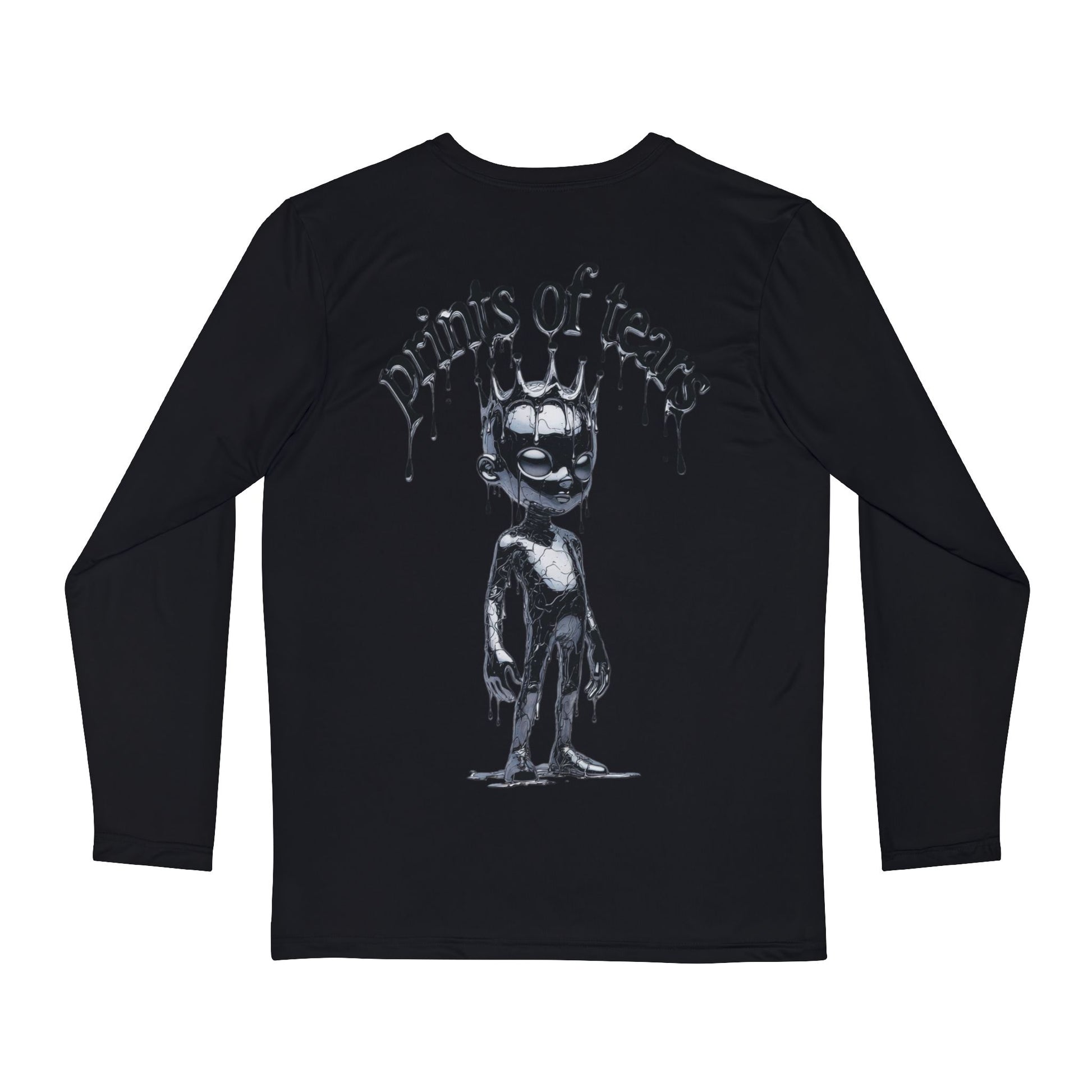 This long-sleeve shirt carries a moody, art-driven energy — a lightweight layer that reads like wearable street art. A small, shadowy emblem rests over the chest while the back showcases a haunting character crowned in rough, hand-rendered strokes. The dark palette and distressed typography give it an underground, skate-and-goth crossover vibe. Slip it on for late-night hangs, shows, or when you want an easy, expressive layer that speaks in atmosphere rather than logos.